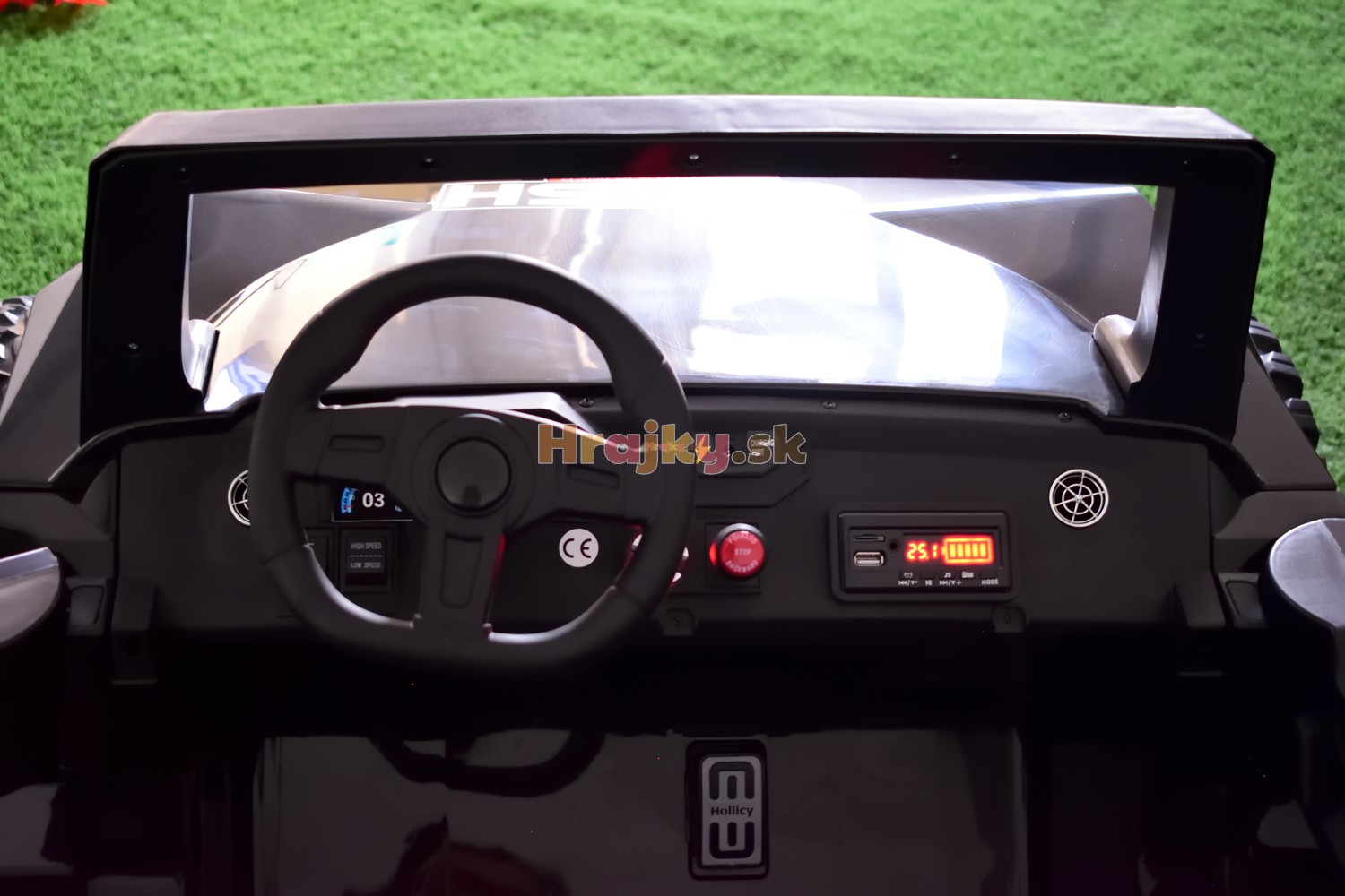 Dvojmiestna čierna elektrická bugina je ideálna pre deti vo veku od 5 do 12 rokov. Táto dvojmiestna elektrická bugina ponúka výkon 300W vďaka štyrom elektromotorom po 75W a batérii 12V/7Ah. S prémiovým dizajnom a množstvom funkcií, ako sú LED svetlá, zvukové efekty a diaľkové ovládanie, toto vozidlo zaručuje bezpečnú a zábavnú jazdu pre dve deti.